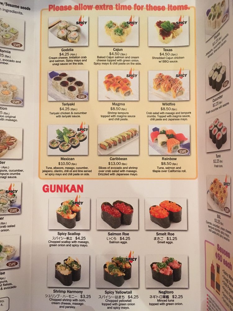 4 pieces. Cream cheese, tempura crumbs, imitation crab and green onions with spicy sesame, topped with spicy mayo and chili paste.